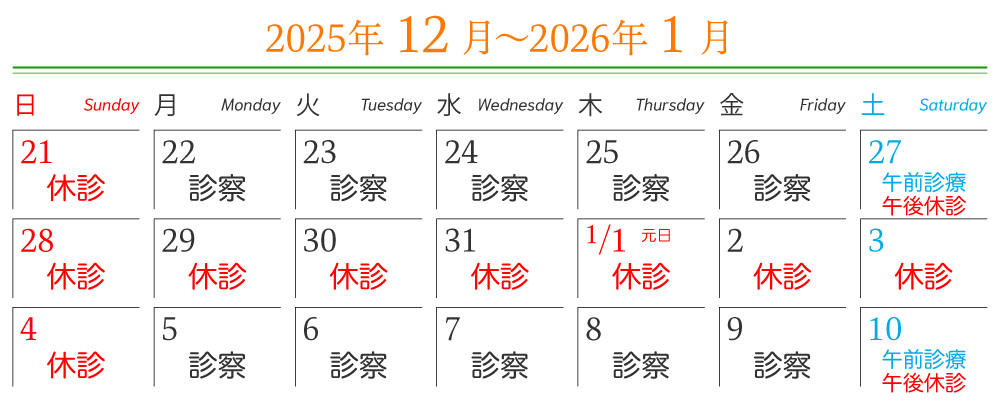 HOME お知らせ 年末年始休診のお知らせ 年末年始休診のお知らせ 2025年12月28日(日)から2026年1月4日(日)まで年末年始の休診とさせていただきます。1月5日(月)から通常診療いたします。ご不便をおかけいたしますが、よろしくお願いいたします。